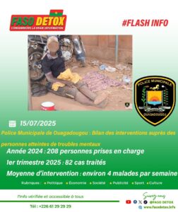 Dans le cadre de ses missions de protection des personnes et de maintien de l’ordre public, la Police Municipale de Ouagadougou à travers sa Direction de la Sécurité Publique (DSP) intervient régulièrement après des personnes en situation de vulnérabilité, notamment des personnes atteintes de troubles mentaux. Ces individus sont souvent en rupture familiale totale ou sans prise en charge médicale adéquate, représentant un enjeu majeur de santé et de sécurité publiques dans l’espace urbain.
